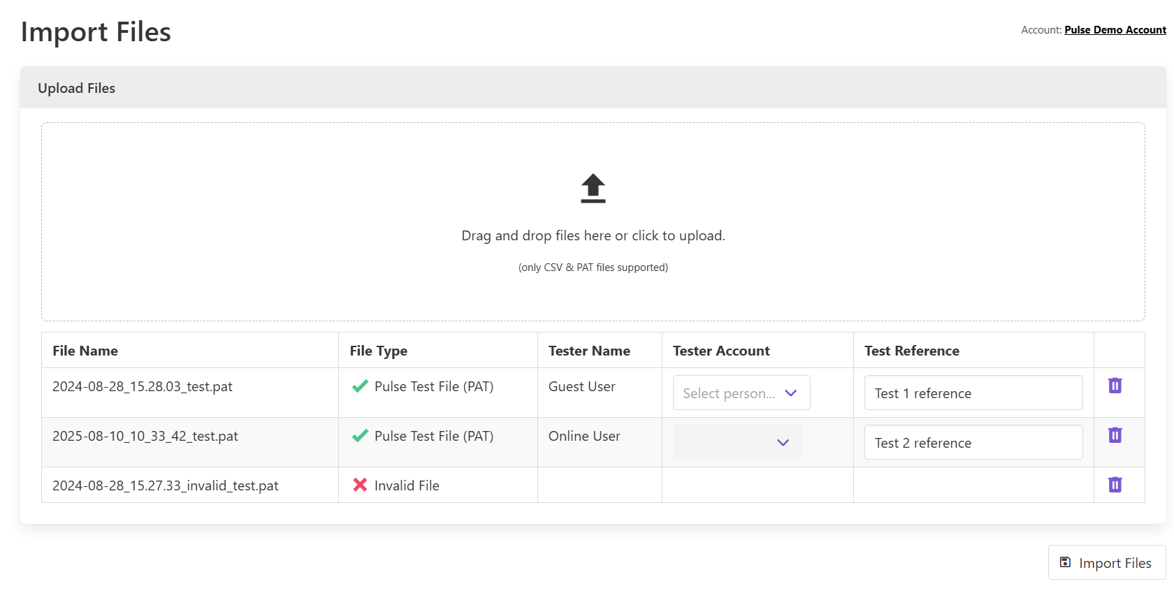 To upload test files via USB, you must first export them from the controller on to a compatible USB flash drive. Then on the Import Files page of Pulse Online, you can upload the .PAT files that were exported to the root of your USB flash drive. Using your computer, either drag and drop the files or select them from the assigned USB drive letter using the open file dialog.