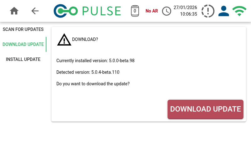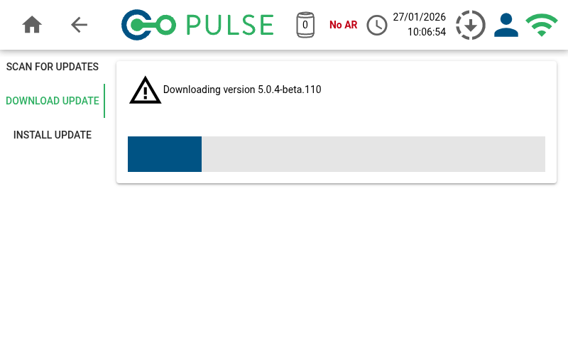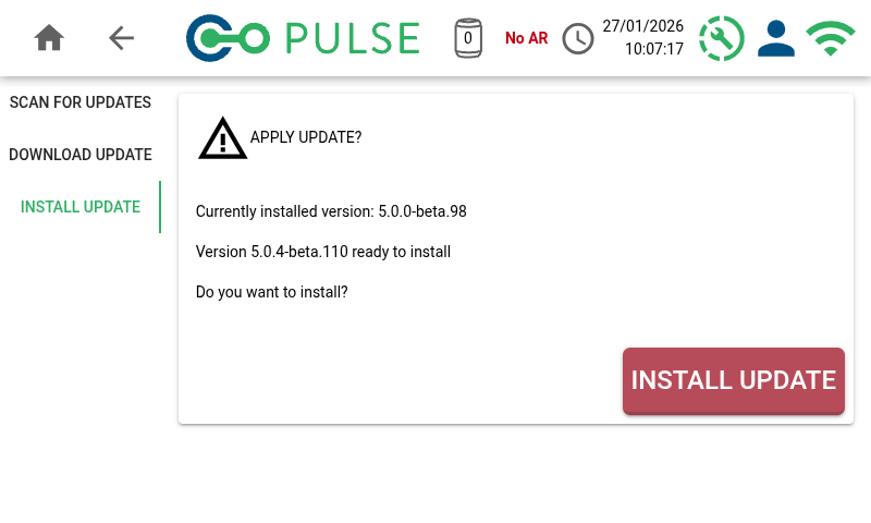 Download the latest software package from the Software Downloads page of Pulse Online and copy it to a USB flash drive. Insert the USB flash drive into the controller, then navigate to the Settings screen and click the Update from USB button to begin the update process.