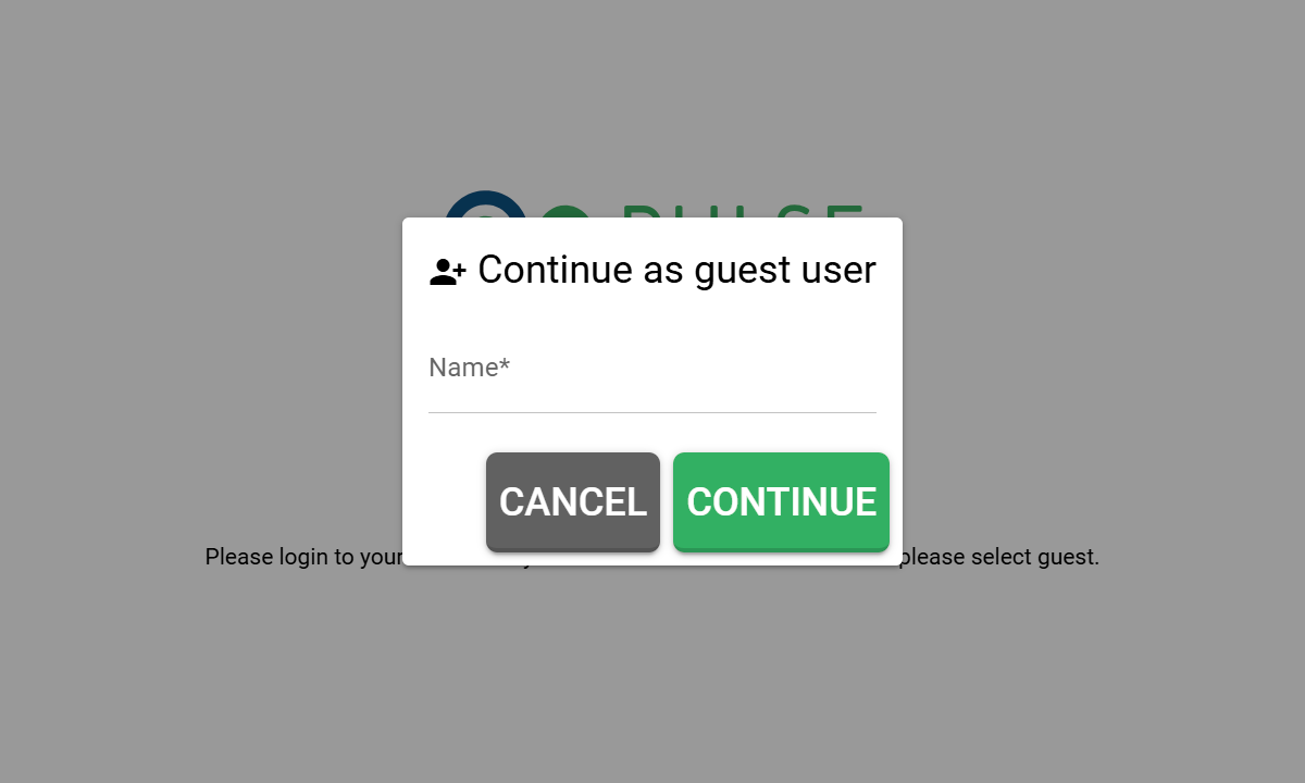 To use your Pulse equipment offline or without Wi-Fi, you can create a guest user locally on the device. On the main login screen, select the Create Guest icon and enter the full name of the person who will be using the kit. Create guest