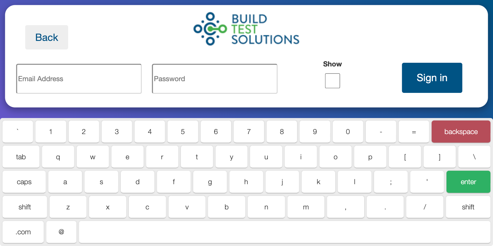 On the main login screen, select the Login icon to sign in as an cloud user. You will be directed to the BTS Single Sign-On (SSO) web page and required to enter your email address and password. SSO sign in page
